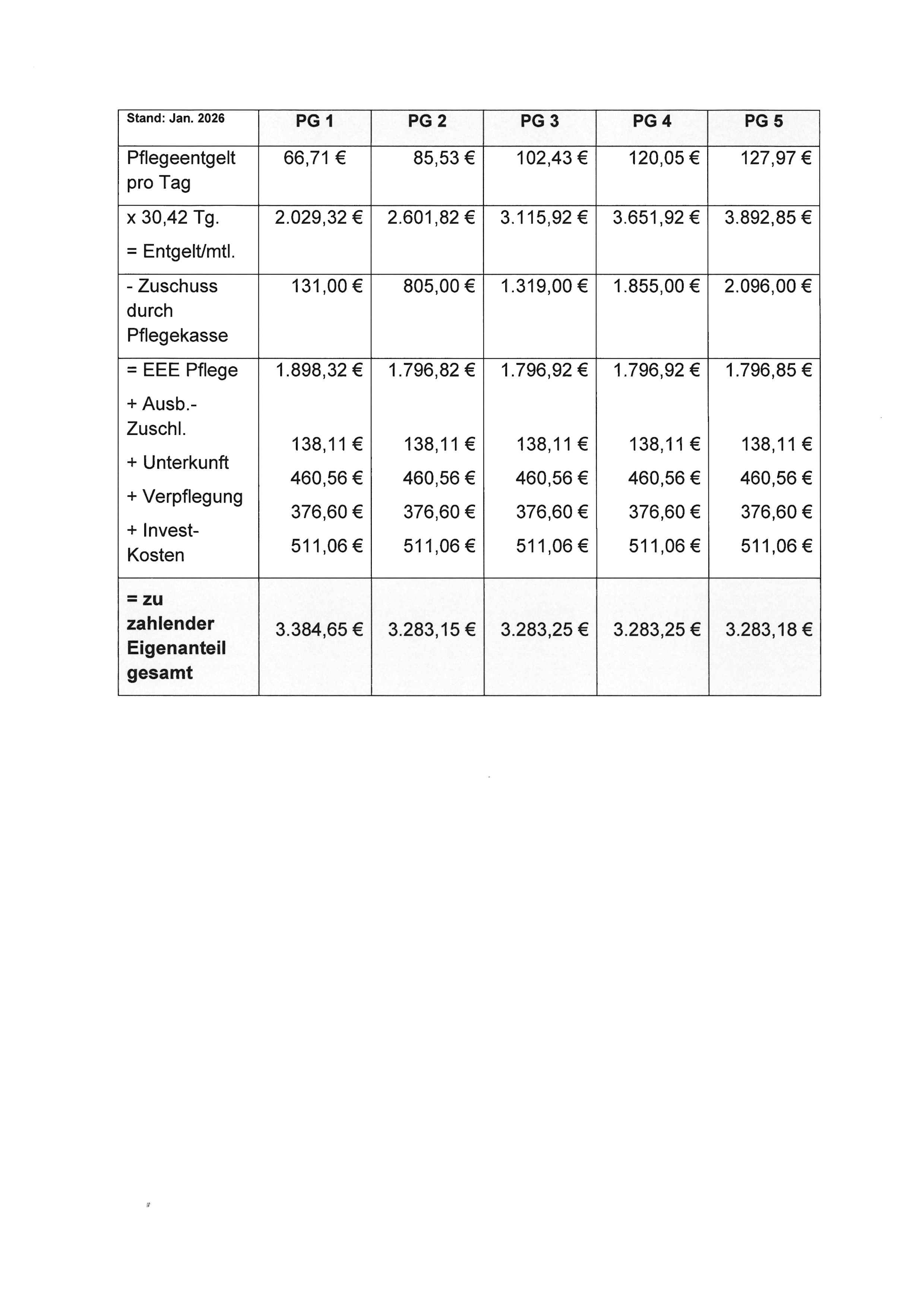 Bei gesetzlich pflegeversicherten Bewohnerinnen und Bewohnern erfolgt, nach Einstufung in einen Pflegegrad (PG), die Abrechnung der gesetzlich geregelten Zuschüsse direkt mit der Pflegekasse. Die Kosten, die darüber hinausgehen (Eigenanteil), werden der Bewohnerin/dem Bewohner in Rechnung gestellt.